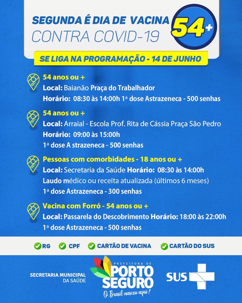 SEGUNDA É DIA DE VACINAÇÃO CONTRA A COVID-19 – 54 ANOS OU MAIS