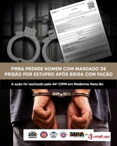Após os procedimentos médicos, o autor foi apresentado na Delegacia de Polícia Medeiros Neto, onde, após consultas aos sistemas, foi constatado um mandado de prisão em aberto por estupro de vulnerável.