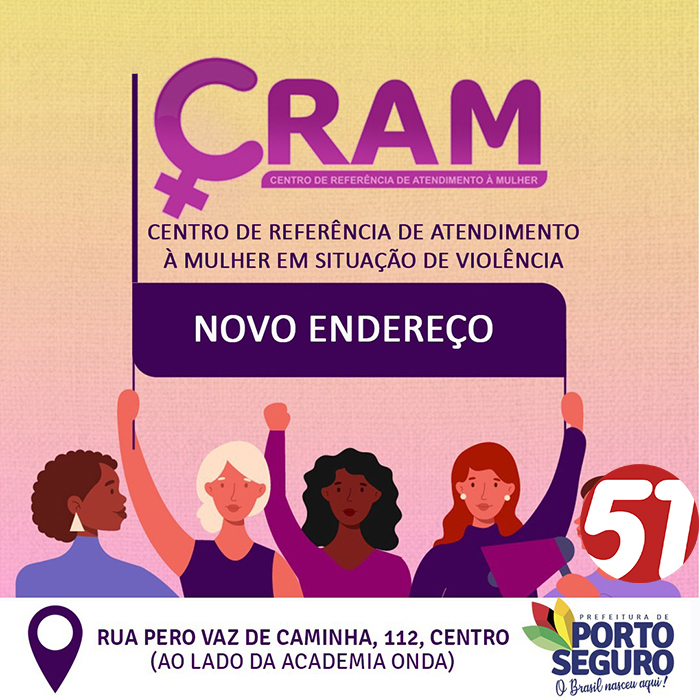 Para melhor servir à comunidade, o Centro de Referência de Atendimento à Mulher (Cram) está em novo endereço, situado na Rua Pero Vaz de Caminha, nº 112, no centro de Porto Seguro. A nova estrutura conta com cinco salas para realização de acolhimento e ações administrativas. A equipe é composta um técnico administrativo/acolhimento, auxiliar administrativo, psicólogo, motorista, profissional para serviços gerais, coordenadora e duas assistentes sociais.