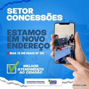 O setor de Concessões da Prefeitura Municipal de Porto Seguro está com novo endereço, agora funcionando na sede da Secretaria de Serviços Públicos. O cidadão pode contar com o atendimento presencial das 08h às 14h, no endereço: Rua 13 de Maio, número 50 – Centro.
