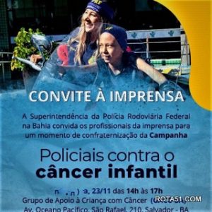 A Polícia Rodoviária Federal na Bahia tem a honra em convidar os profissionais da imprensa a participarem da confraternização de encerramento da campanha Policiais Contra o Câncer Infantil 2022.