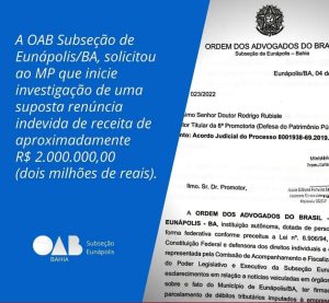 A OAB Subseção de Eunápolis/BA, por intermédio da Comissão de Acompanhamento e Fiscalização dos Trabalho dos Poderes Legislativo e Executivo Municipais, protocolou ofício na 8ª Promotoria de Justiça do Ministério Público Estadual, entidade essa que possui competência para apurar condutas danosas ao Patrimônio Público, solicitando investigação quanto aos fatos veiculados na imprensa local e tomados nos Autos do Processo 8001938-69.2019.8.05.0079, em trâmite na Vara da Fazenda Pública da Comarca de Eunápolis/BA.