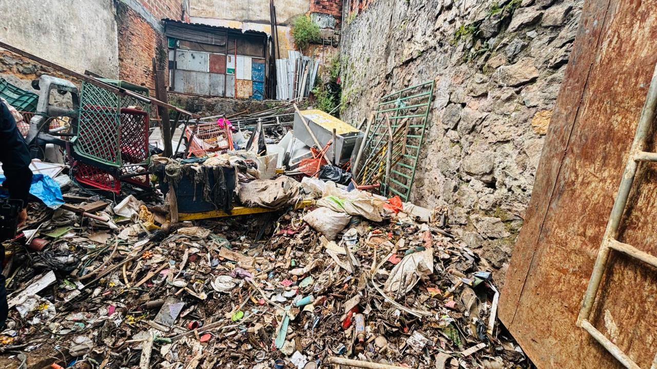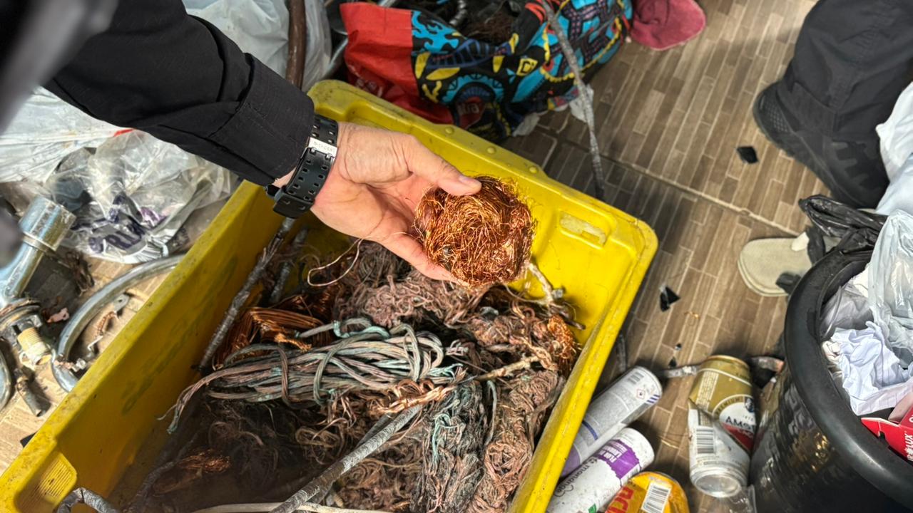 localizou grande quantidade de fios de cobre, armas, notebook, documentos, e acúmulo de lixo que representava risco à saúde pública