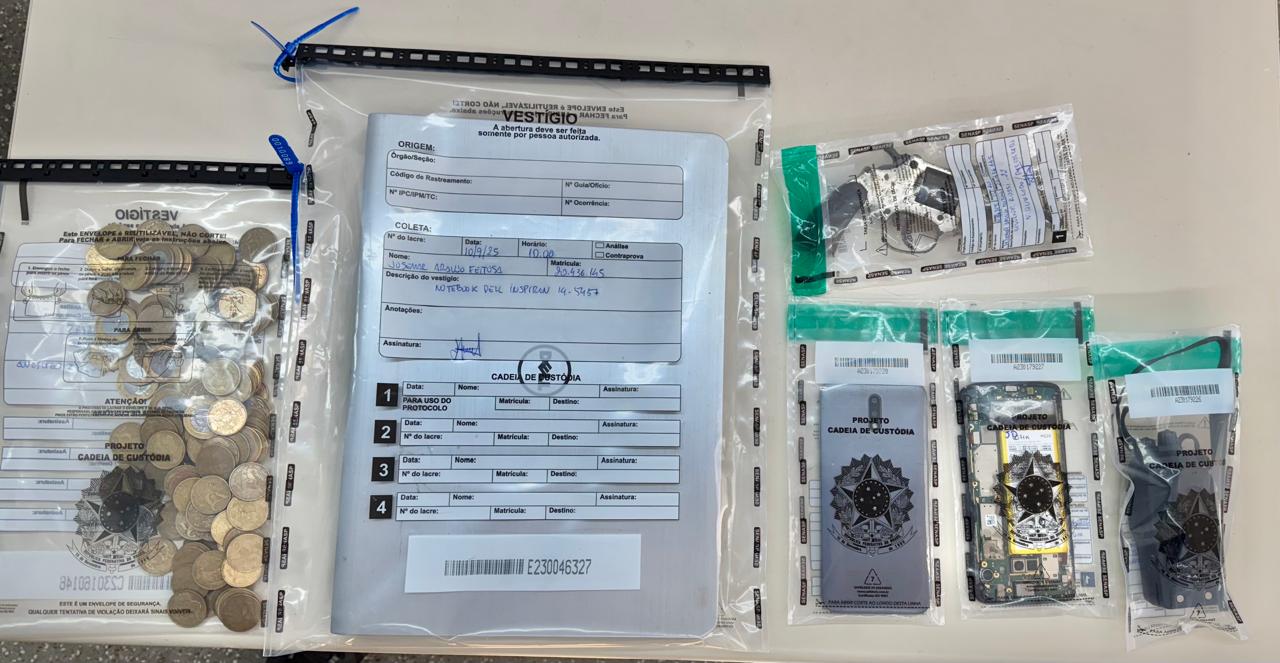 Durante a ação, foi encontrada grande quantidade de cabos de cobre, fios elétricos furtados de equipamentos urbanos, um revólver calibre 22, armas brancas, documentos, um notebook, dois celulares, um rádio comunicador, R$ 43 reais, fios queimados, além de peças de um abrigo de ponto de ônibus. O estabelecimento estava fechado no momento da diligência, sem a presença do proprietário.