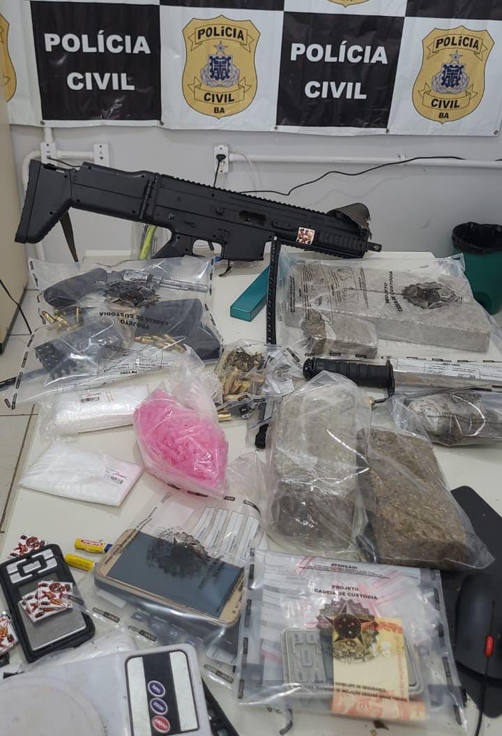 Uma operação deflagrada pela Polícia Civil da Bahia, na manhã desta sexta-feira (16), resultou na prisão em flagrante de um homem de 24 anos e na apreensão de armas de fogo de uso restrito, munições e drogas no município de Iguaí. A ação, denominada Operação Purgato, teve como objetivo o cumprimento de mandados de busca e apreensão e de prisão expedidos pela Vara Criminal da comarca local.