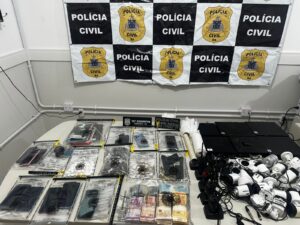 Na ação, as equipes apreenderam uma pistola Glock calibre .380 com numeração raspada, 36 munições, dois carregadores, drogas (cocaína, maconha e crack), mais de R$ 23 mil em espécie, 14 celulares, quatro radiocomunicadores, 24 câmeras de vigilância, sete cadernos de anotações do tráfico e embalagens para acondicionamento de entorpecentes. Parte da droga foi localizada enterrada no quintal de um dos alvos, com apoio do Canil da CORE.