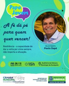 Projeto que promove o diálogo entre a juventude e diversos setores da sociedade, o “Papo Jovem” desta quarta-feira, dia 24, vai abordar o tema: A fé dá pé para quem quer vencer. O evento, que é resultado da parceria entre Prefeitura de Eunápolis e Câmara de Vereadores, terá como palestrante o secretário municipal da Casa Civil e Desenvolvimento Econômico, Paulo Dapé.