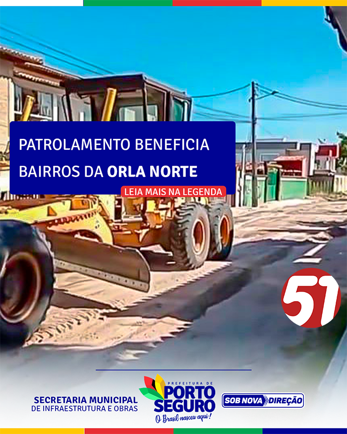 O patrolamento do Village na parte alta deve ser realizado em breve, pois nesta terça, 09/03, as máquinas seguiram para o Arraial d’Ajuda. O objetivo é beneficiar todos os bairros e comunidades do município, seguindo a programação que está sendo desenvolvida pela pasta.