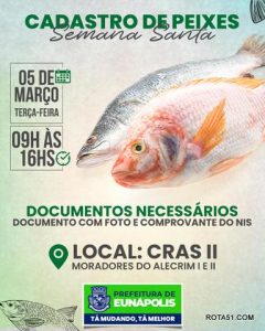 Repetindo o sucesso do ano passado, a Prefeitura de Eunápolis, por direcionamento da prefeita Cordélia Torres, distribuirá 18 mil quilos de peixe para as famílias carentes na Semana Santa. Para agilizar o processo de entrega do pescado, a equipe da Secretaria Municipal de Assistência Social estará nesta terça-feira (05) nos bairros Alecrim I e II para realizar o cadastro dos beneficiários do Bolsa Família, oferecendo vouchers que darão direito a retirar o peixe. A ação acontecerá no Cras 2, localizado no Alecrim II, das 9h às 16h.