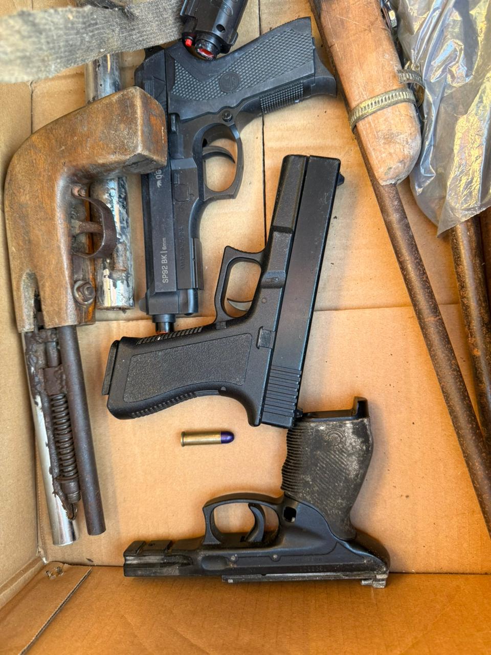 Ao averiguar o local, os policiais localizaram a caixa contendo 07 armas de fabricação caseira, 04 simulacros, 01 munição calibre .38 de treino, 04 buchas de maconha e R$ 100,00.