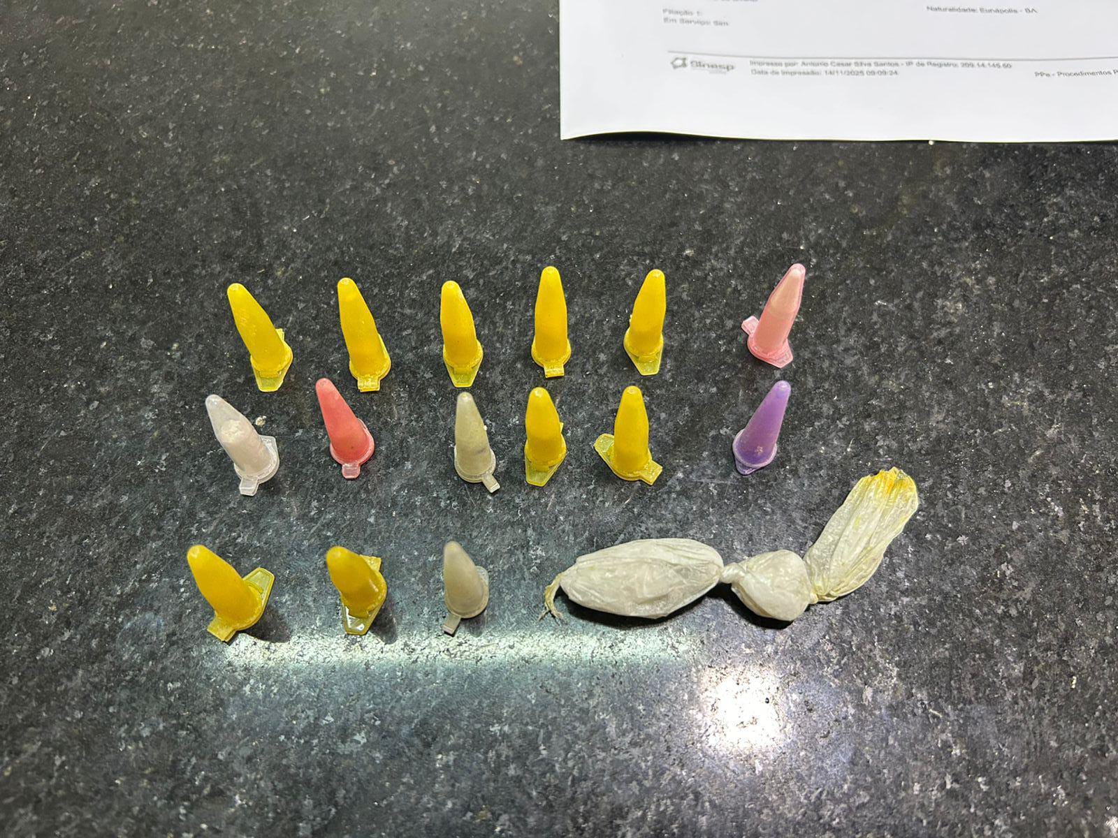 Ao perceberem a aproximação da viatura, ambos empreenderam fuga, sendo que um deles foi alcançado e durante a abordagem, foi localizado em sua posse uma sacola plástica contendo 15 pinos de eppendorf de cocaína, mais uma trouxinha.