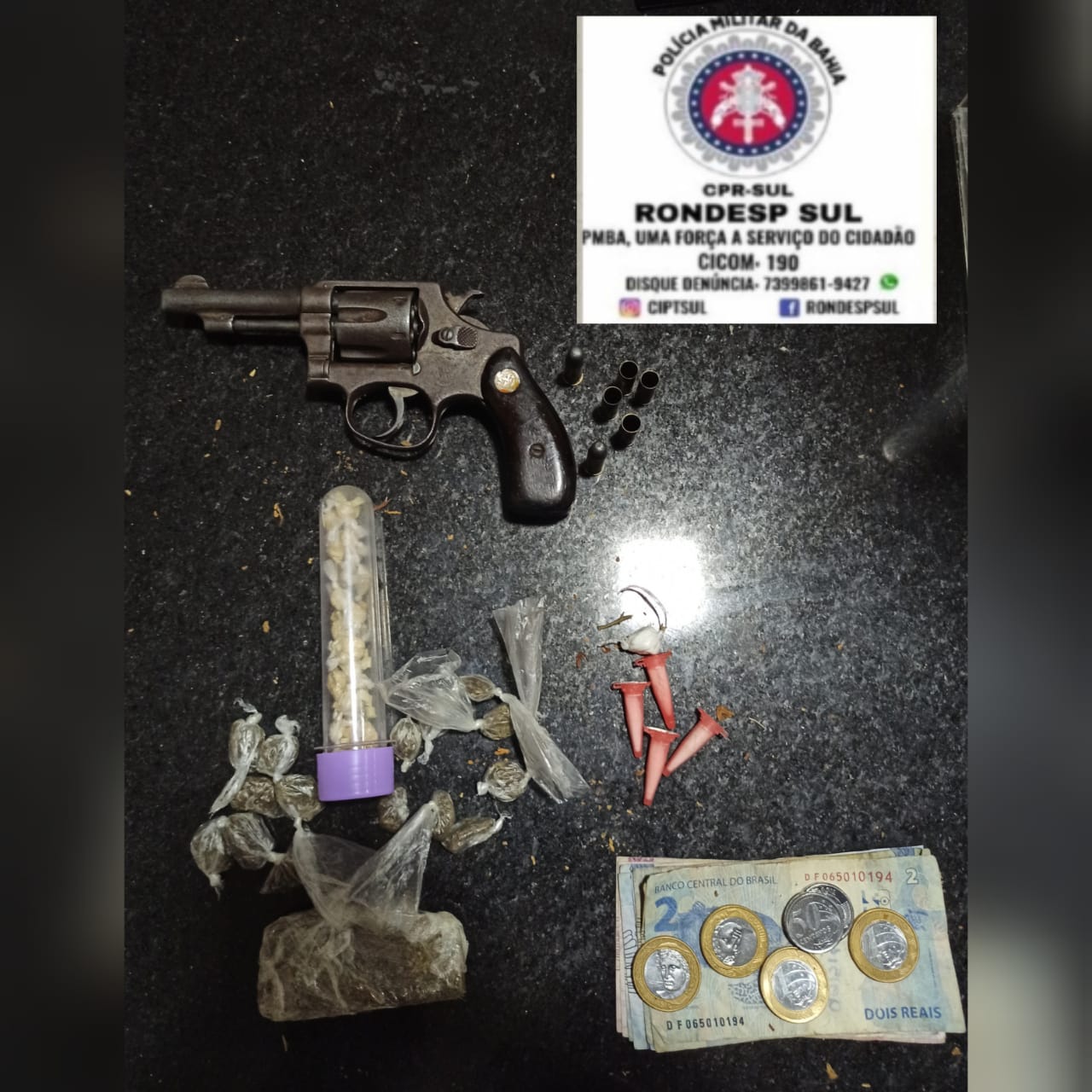 ☑️ 01 revólver calibre .32, marca Smith Wesson, num° 560088, com quatro munições deflagradas e duas picotadas;