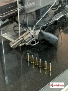 Ao chegar no local, o suspeito foi identificado e ao ser abordado foi encontrado em sua posse uma arma de fogo tipo revólver.