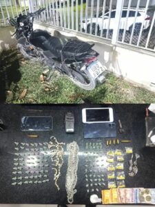 A Polícia Militar da Bahia, por meio do 28º BPM/Eunápolis, informa que, por volta das 21h30 do dia 19 de abril de 2026, durante rondas no bairro Juca Rosa, em Eunápolis, guarnições avistaram dois indivíduos em uma motocicleta que, ao perceberem a presença policial, demonstraram nervosismo e tentaram evadir do local. Diante da atitude suspeita, foi realizado acompanhamento tático e a devida abordagem. Durante a busca pessoal, foram encontrados diversos materiais ilícitos em posse dos abordados. Questionados, relataram atuação em área dominada por organização criminosa. Os envolvidos foram conduzidos e apresentados na Delegacia de Polícia, juntamente com todo o material apreendido, para adoção das medidas cabíveis.
