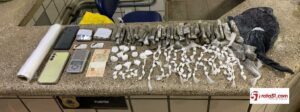 — 130 gramas de cocaina (109 papelotes e 13 pedaços maiores)