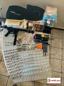 Dando continuidade à diligência, foram apreendidos outros materiais no imóvel, totalizando: uma submetralhadora calibre 9mm de fabricação artesanal, quatro munições calibre 9mm e uma munição calibre .38; um par de coletes balísticos; 06 rádios comunicadores além de 69 “pinos” eppendorf e uma porção pequena de cocaína; uma porção grande e 160 porções pequenas de crack; um tablete grande e 67 porções menores de maconha; quatro porções de skunk; 21 porções de haxixe;  dinheiro, aparelhos celulares e outros itens utilizados para a prática de tráfico de drogas.