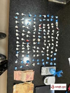 O suspeito foi alcançado e em sua posse uma sacola plástica contendo 126 trouxinhas de substâncias análoga a cocaína (117gr), 01 trouxa grande de substância análoga a cocaína (22gr), 200 reais em espécie, 02 balanças de precisão e 01 aparelho de celular.