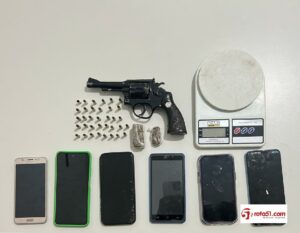 A ação rápida e eficiente dos policiais resultou na apreensão de um revólver calibre .22, 40 munições do mesmo calibre, 28 gramas de substância análoga à maconha, além de materiais relacionados ao tráfico, como uma balança de precisão e um caderno de anotações.
