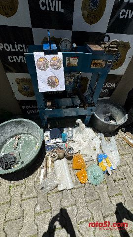 Durante a entrada no imóvel, foram apreendidos 4,150 kg de cocaína, balanças de precisão, uma prensa hidráulica, facas, eppendorfs, fitas adesivas, sacos plásticos e outros apetrechos utilizados na produção e acondicionamento de drogas.