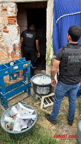No curso das investigações, os policiais identificaram um imóvel que funcionava como laboratório de refino de entorpecentes. Ao se aproximarem da residência, os investigadores avistaram diversos materiais típicos da fabricação e embalagem de drogas ilícitas.