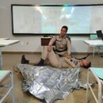 Durante a parte teórica, foram abordados temas como a prioridade no controle de hemorragias, o manejo básico da via aérea e a prevenção da hipotermia. Também foi explicado o conceito da chamada tríade letal do trauma, que consiste na combinação de três fatores que aumentam o risco de morte em vítimas de ferimentos graves, quais sejam, hipotermia (queda da temperatura corporal), acidose (alteração do equilíbrio ácido-base do organismo) e coagulopatia (dificuldade do sangue em coagular). O instrutor explicou que esses três elementos se retroalimentam e podem agravar rapidamente o quadro clínico, tornando o atendimento inicial ainda mais determinante para a sobrevivência.