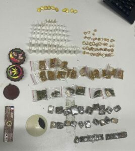 Após o acompanhamento e mediante verbalização e ordens legais, os suspeitos se renderam. Durante a abordagem, foram encontrados com os indivíduos 64 pinos de cocaína, 29 buchas de maconha, 13 buchas de haxixe, 44 pedras de crack, 10 comprimidos de MD, além de 02 dichavadores.