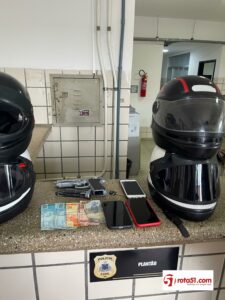 Foram apreendidos também as duas motos, uma Honda XRE 300 e uma Yamaha YBR, três celulares Iphone, R$ 242,00 e mochilas com roupas pessoais.