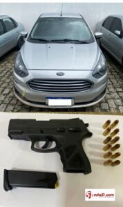O caso ocorreu por volta das 10h30, na Rua Cora Coralina, quando a guarnição foi acionada para verificar uma situação de desentendimento comercial envolvendo a posse de um terreno. Ao chegar ao local, os policiais avistaram um homem retirando uma arma da cintura e entrando em um veículo Ford Ka, de cor cinza, que estava estacionado dentro do terreno.