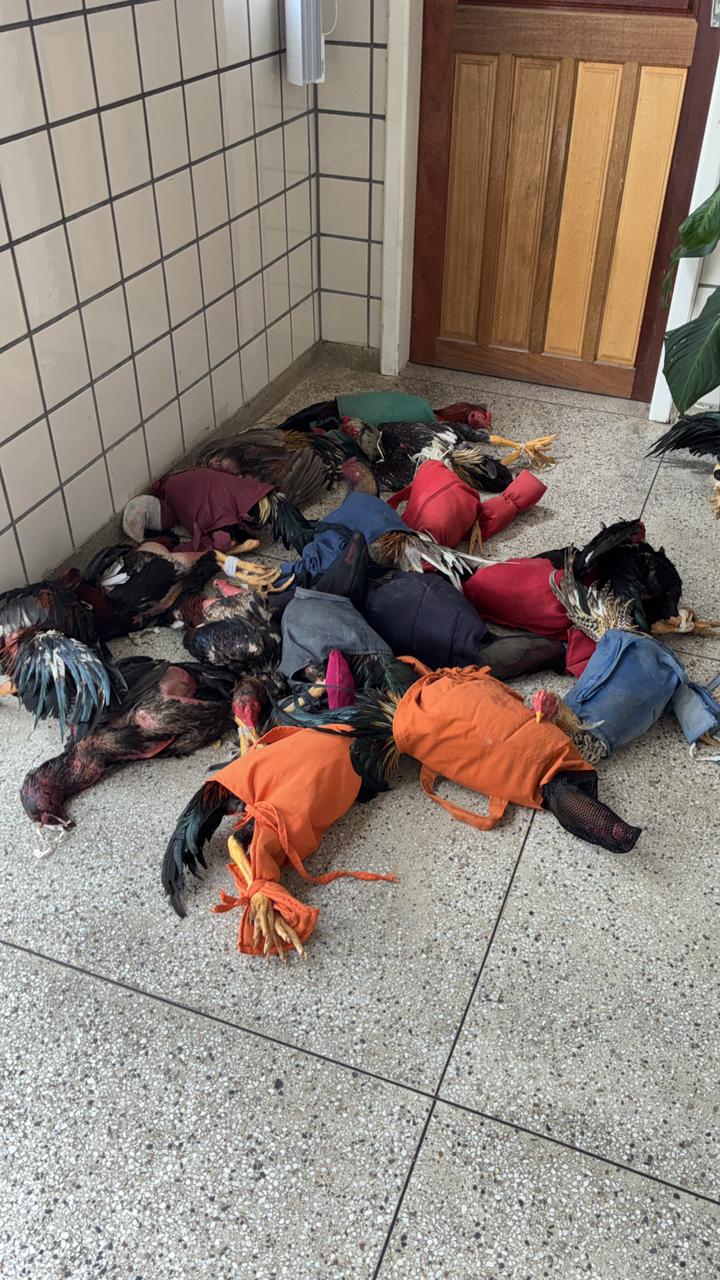 Durante a ação, foram encontrados diversos galos de combate com evidentes sinais de maus-tratos, apresentando ferimentos, ausência de penas e presença de sangue. No local também foram apreendidos materiais utilizados nas rinhas, como esporas artificiais, bornais e instrumentos de preparação dos animais.
