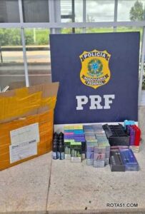 A Polícia Rodoviária Federal (PRF) apreendeu, nesta terça-feira (02), 62 cigarros eletrônicos e mais 10 insumos/essências durante fiscalização no Km 830 da BR 116, em Vitória da Conquista (BA).