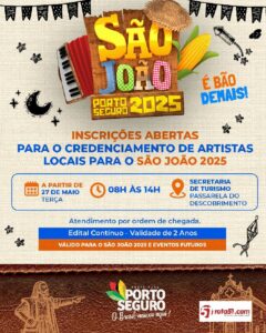 A Secretaria de Turismo de Porto Seguro abre inscrições para o maior edital cultural já realizado no município, exclusivo para moradores, nesta terça-feira, 27. O processo de credenciamento contempla bandas, artistas solos, grupos de dança, agremiações culturais e de expressões musicais de diversos estilos, visando compor o calendário anual de eventos da cidade, incluindo a programação do São João 2025.