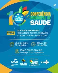 A Prefeitura de Porto Seguro, por meio da Secretaria Municipal de Saúde e do Conselho Municipal de Saúde (CMS), realizará no dia 17 de julho a 10ª Conferência Municipal de Saúde, com o tema: