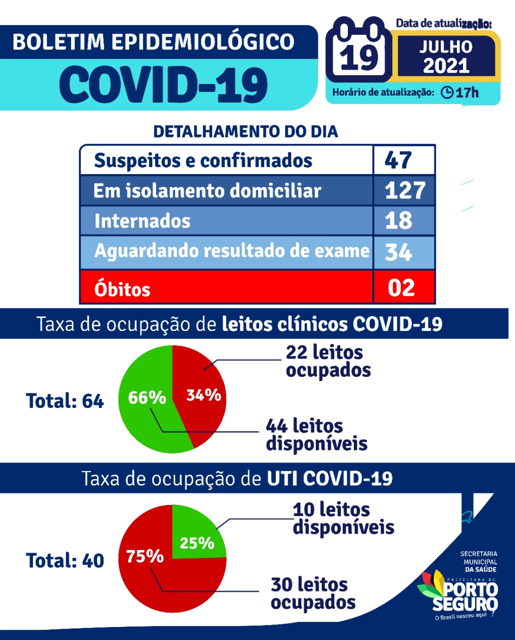 A Prefeitura de Porto Seguro, através da Secretaria Municipal de Saúde, informa que no período de 14/03/2020 a 19/07/2021, foram 23.152 casos de COVID-19, sendo 10.619 confirmados e 12.533 suspeitos, classificados de acordo com a sintomatologia clínica.