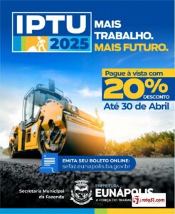 Os contribuintes de Eunápolis têm até o dia 30 de abril para aproveitar o desconto de 20% no pagamento em cota única do IPTU 2025. A contribuição é essencial para garantir investimentos em áreas prioritárias como saúde, educação e infraestrutura.