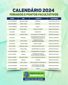 É válido ressaltar que, mesmo durante os pontos facultativos e feriados, os serviços essenciais do município permanecerão em pleno funcionamento. “Saúde, segurança e demais áreas fundamentais seguirão operando regularmente, garantindo a continuidade do atendimento à população e a manutenção da ordem pública”, frisou a prefeita Cordélia Torres.