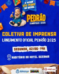O prefeito de Eunápolis, Robério Oliveira, realizará nesta segunda-feira, 2 de junho, o lançamento oficial do Pedrão 2025 – o maior São Pedro do Brasil –, durante uma coletiva de imprensa com início às 19h, no auditório do Hotel Oceania, localizado no bairro Dinah Borges.