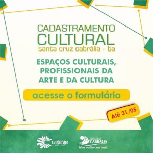 A Prefeitura de Santa Cruz Cabrália, por meio da Secretaria Municipal de Cultura, está realizando até dia 31 de maio o cadastramento de espaços culturais e de artistas e profissionais da cultura que atuam no município. O objetivo é obter indicadores que servirão para, em momento seguinte, habilitar para recebimento de recursos da Lei Paulo Gustavo.