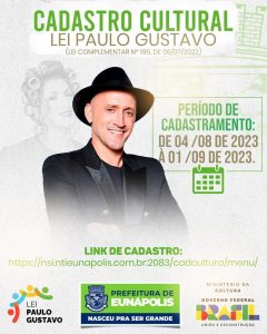 Nesta sexta-feira (04), a Prefeitura de Eunápolis – por meio da Secretaria Municipal de Esporte, Juventude, Cultura e Lazer – abriu o período de cadastramento destinado a artistas, trabalhadores da cultura, grupos, bandas, coletivos, espaços e empresas artísticas e culturais que atuam no município. O cadastro deve ser realizado por meio do link [https://nsi.ntieunapolis.com.br:2083/cadcultura/menu/ ].