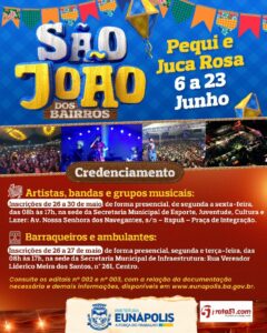 O tradicional São João dos Bairros acontecerá de forma simultânea entre os dias 06 e 23, nos bairros Pequi e Juca Rosa. Os editais completos, bem como demais informações relativas aos chamamentos, estão disponíveis no site oficial do Município, que pode ser acessado por meio do link: