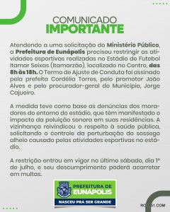 Atendendo a uma solicitação do Ministério Público, a Prefeitura de Eunápolis precisou restringir as atividades esportivas realizadas no Estádio de Futebol Itamar Seixas (Itamarzão), localizado no Centro, das 8h às 18h. O Termo de Ajuste de Conduta foi assinado pela prefeita Cordélia Torres, pelo promotor João Alves e pelo procurador-geral do Município, Jorge Cajueiro.
