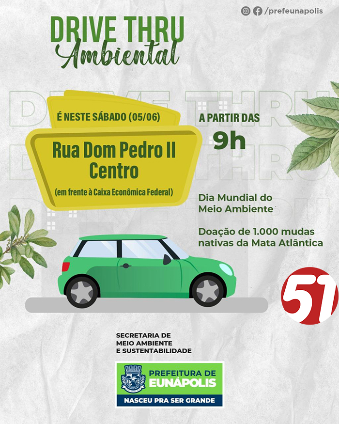 ☘A Prefeitura de Eunápolis por meio da secretaria de meio ambiente e sustentabilidade realiza o DRIVE THRU AMBIENTAL com a doação de 1000 mudas de plantas nativas da Mata Atlântica. É neste sábado [05/06] a partir das 9 horas na Rua Dom Pedro II – centro – Em frente à caixa econômica Federal. 🌱🍃![]()