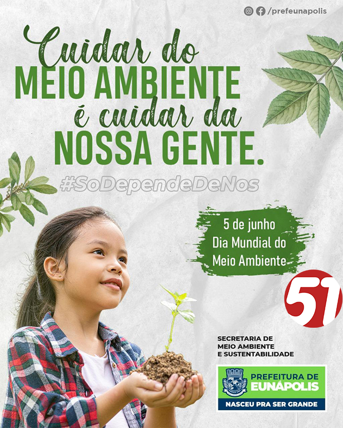 Dia 05 de junho, data que comemoramos o Dia Mundial do Meio Ambiente, a importância da preservação, conservação e equilíbrio ambiental, é celebrada com avanços sem precedentes pela prefeitura de Eunápolis. Diante das recentes conquistas promovidas pelo governo municipal, levando em consideração, que, a gestão pública no município deu um salto para o futuro nas questões ambientais, desde o respeito pelo ambiente verde existente em exuberância na cidade, com ações diretas em cartões postais, como: Projeto Mais Verde – que revitaliza todas as áreas verdes do município; Projeto de Reurbanização do Parque Ecológico do Gravatá; plantio de mudas de árvores em escolas públicas municipais; limpeza de feiras livres e, para mostrar a importância ambiental no governo municipal, a Secretaria de Meio Ambiente e Sustentabilidade fará a distribuição para a população, de mil mudas de arvores nativas da mata atlântica e, ainda, mais de duzentos exemplares de mudas para jardinagem.