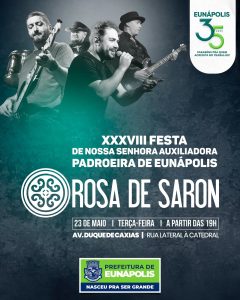 Para comemorar a 38ª Festa de Nossa Senhora Auxiliadora, padroeira da cidade, a Prefeitura de Eunápolis realizará um grandioso evento com a atração Rosa de Saron, uma das bandas mais reconhecidas do cenário musical cristão do país.