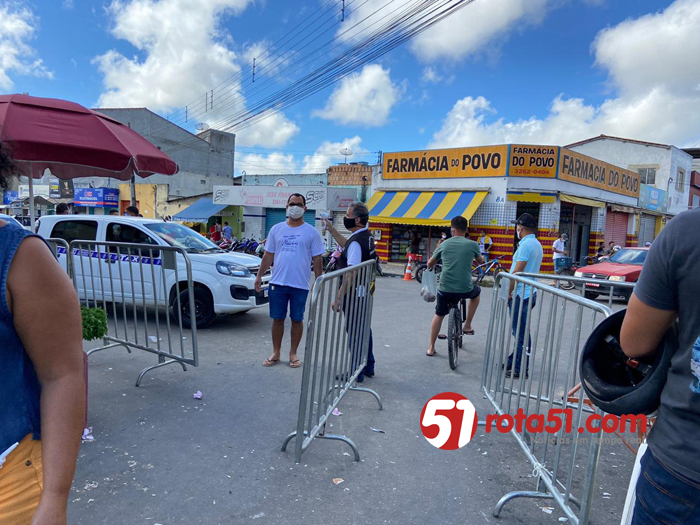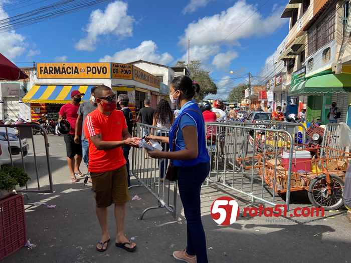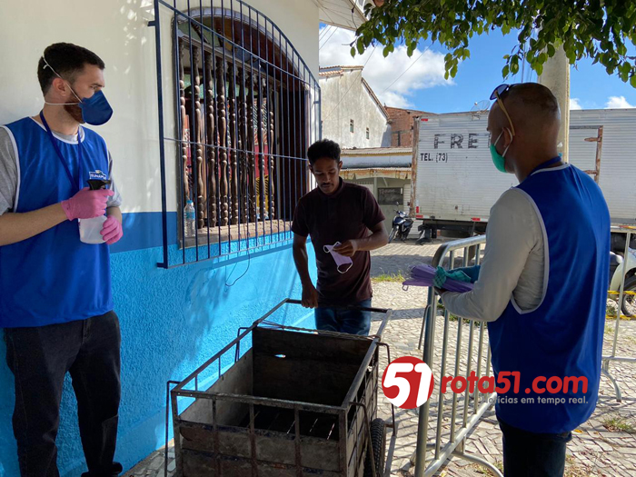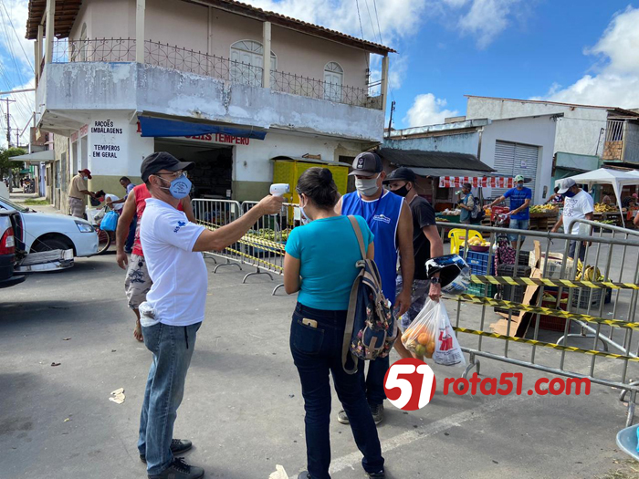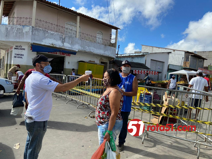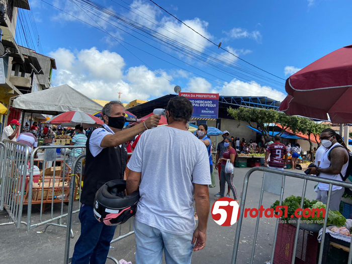 Por determinação do prefeito Robério Oliveira, neste sábado (13/06) as equipes da Prefeitura de Eunápolis (Fiscalização, Meio Ambiente, Trânsito e Vigilância Sanitária) realizam uma grande ação de combate à disseminação do novo coronavírus na Feira do Pequi. Quatro estruturas para controle de acesso à feira foram montadas nas ruas Ana Nery, Nilo Peçanha e Travessa do Pequi, e todos os usuários tem sua temperatura corporal aferida, as mãos higienizadas com álcool 70%, e aqueles que insistem em descumprir o decreto municipal que obriga a utilização de máscara, recebem o EPI gratuitamente para entrar no local.