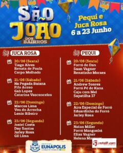 Desde o dia 6 de junho, os bairros têm se transformado em verdadeiros palcos culturais, com apresentações musicais que exaltam a força e a riqueza das tradições nordestinas. A programação se encerra no dia 23 de junho, com destaque para os shows dos cantores Elias Vagner, no bairro Pequi, e Jarley Rosa, no Juca Rosa. As apresentações prometem reunir a comunidade em torno de uma celebração que valoriza a identidade regional e fortalece os laços sociais.