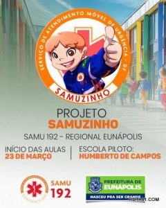 A Prefeitura de Eunápolis, por meio da Secretaria de Saúde, está dando mais um passo importante na conscientização sobre o uso adequado do Serviço de Atendimento Móvel de Urgência (SAMU) com o lançamento do projeto-piloto Samuzinho nas unidades escolares. A Escola Municipal Humberto de Campos, localizado no bairro Gusmão, será a primeira a receber o programa, marcado para este sábado (23). Com um treinamento de 90 dias, contendo dois encontros mensais de duas horas cada, o projeto visa educar alunos do 6º ao 9º ano do ensino fundamental, tanto em escolas públicas quanto privadas, sobre como acionar e utilizar corretamente o SAMU 192.