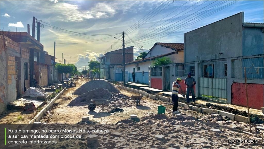 Dentre os sucessivos investimentos nos serviços de infraestrutura está o da Rua Flamingo, no bairro Moisés Reis, que começou a receber pavimentação com blocos de concreto intertravados, garantindo melhorias no tráfego de condutores de veículos e pedestres. Também segue em ritmo acelerado as pavimentações da Rua Lua Nova, no Moisés Reis, e a Rua Recife, no Pequi.