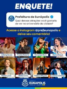 Como parte desse processo participativo, a Prefeitura de Eunápolis também mantém aberta a enquete popular, permitindo que os moradores contribuam diretamente na escolha das atrações. A votação acontece de forma prática e acessível por meio das redes sociais oficiais da Prefeitura, garantindo que a festa seja, de fato, construída com a voz do povo.
