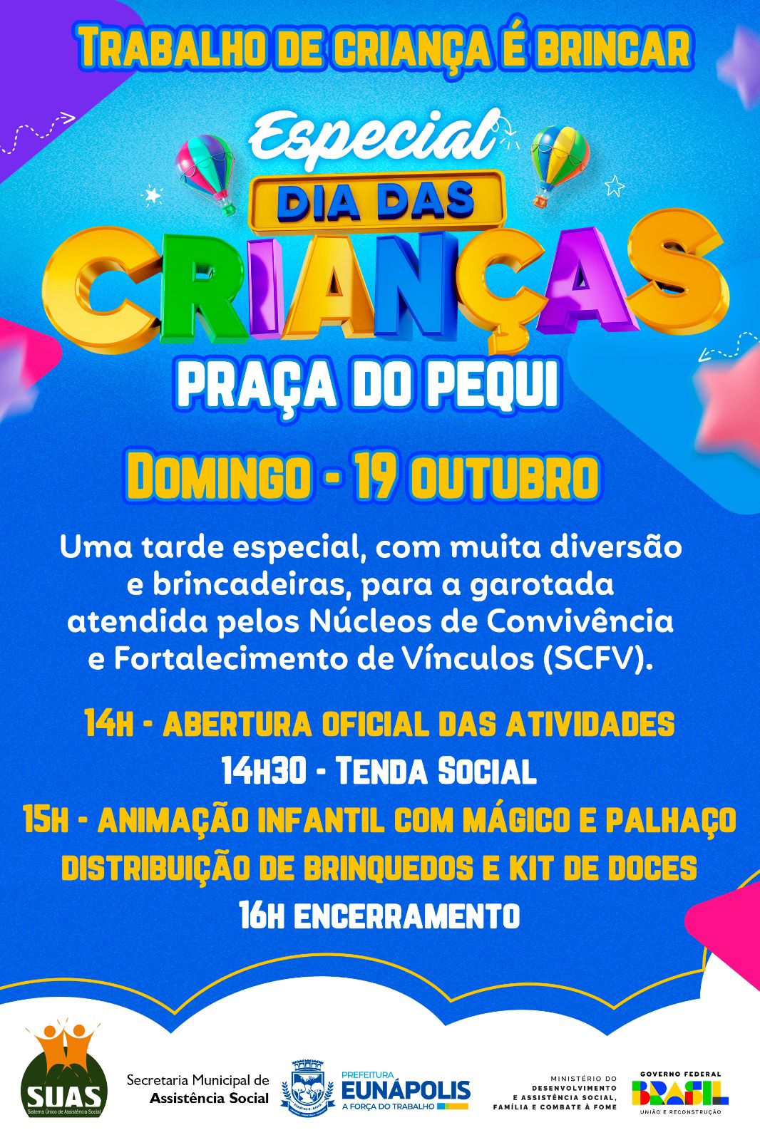 Neste domingo (19), a Praça do Pequi vai se transformar em um verdadeiro parque de alegria e imaginação! A Prefeitura de Eunápolis, por meio da Secretaria de Assistência Social, preparou uma tarde especial para celebrar o Dia das Crianças com muita animação, brincadeiras e momentos inesquecíveis para os pequenos e suas famílias.