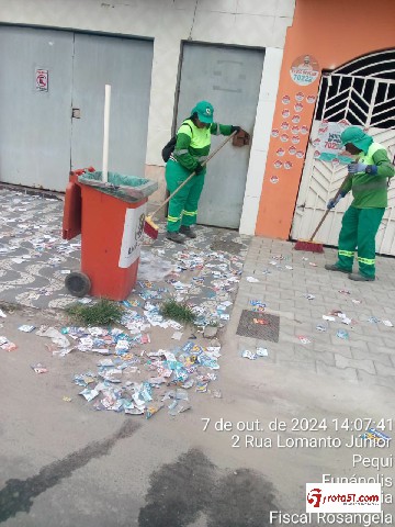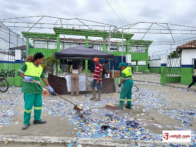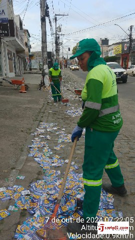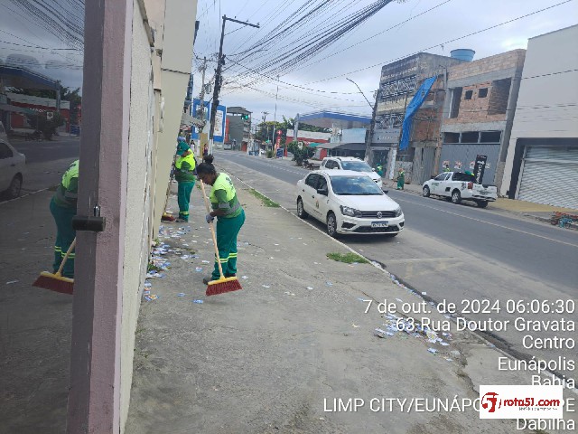 A equipe de limpeza da cidade de Eunápolis realizou, nesta segunda-feira (7), uma força-tarefa para remover os santinhos espalhados pelas ruas devido às eleições municipais. Mesmo sendo ponto facultativo, cerca de 80 funcionários trabalharam das 7h às 15h20 para garantir que a cidade fosse limpa e organizada. A estimativa é que sejam recolhidos entre 350 e 500 kg de material descartado irregularmente, resultado do grande volume de propaganda eleitoral.